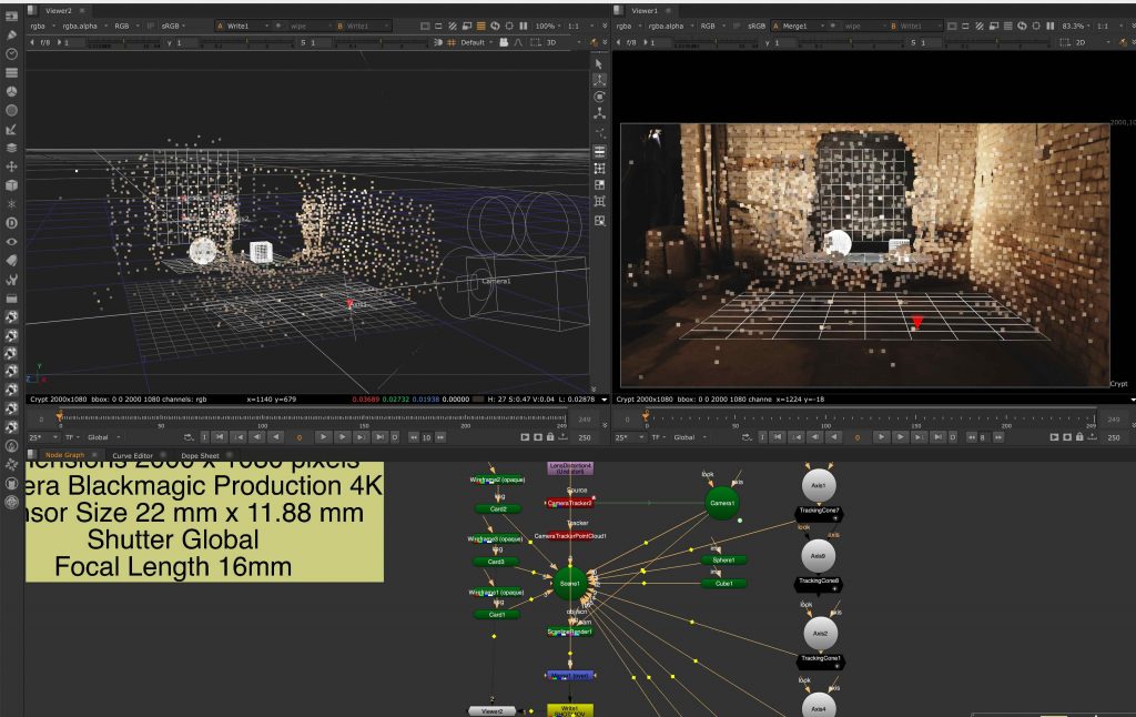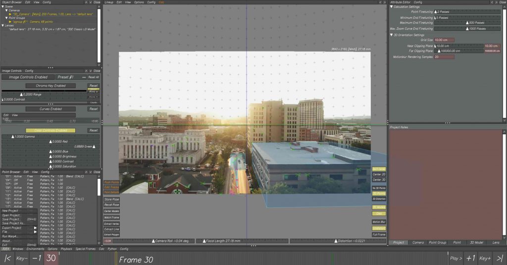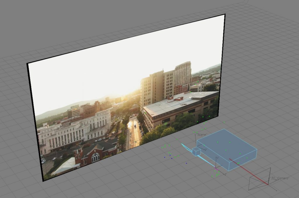 We started by tracking a wide exterior shot of a city environment. The focus here was on identifying stable points across buildings and architectural elements, which allowed us to reconstruct the scene in 3D space. This gave us a clearer understanding of how the camera moves through the environment and how depth can be translated from a flat image into a spatial layout.