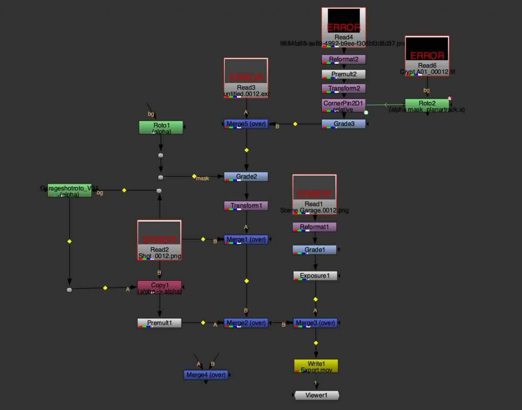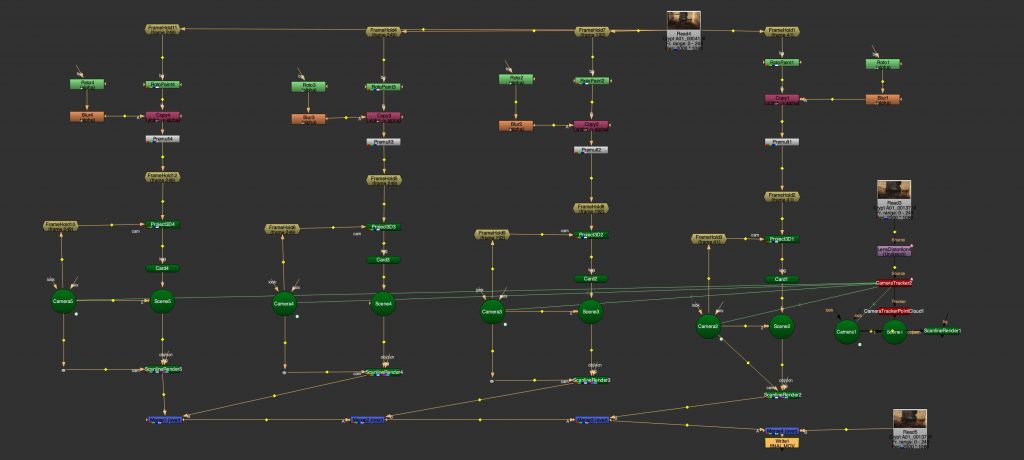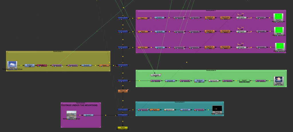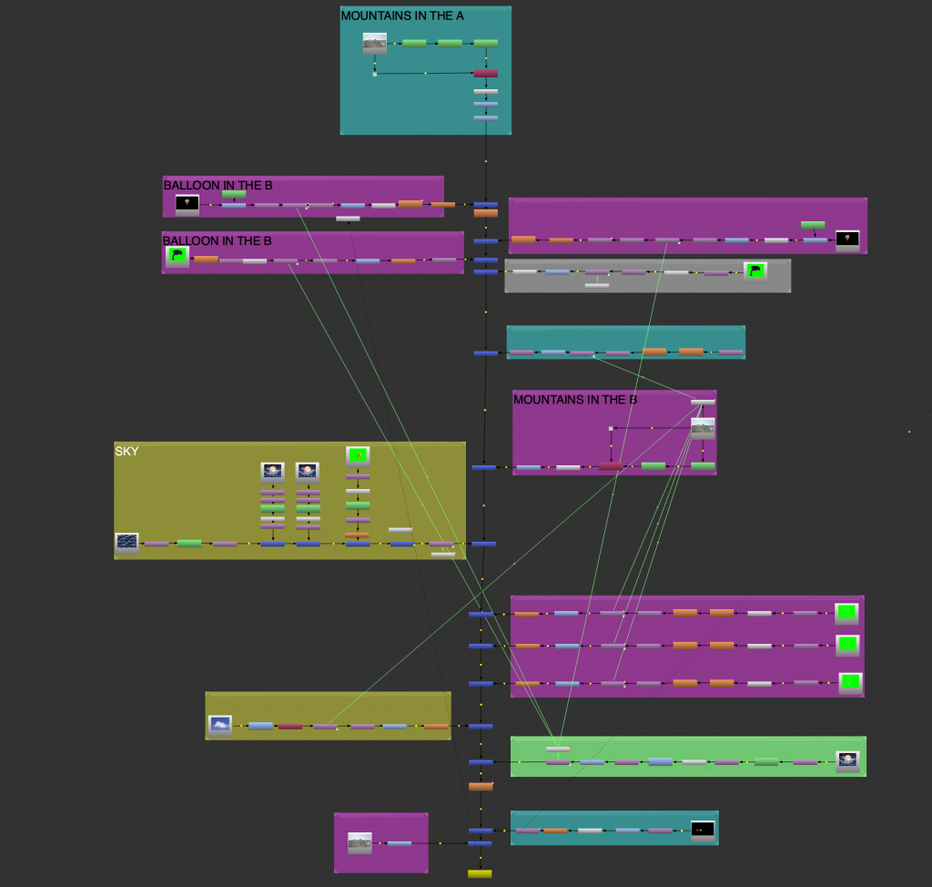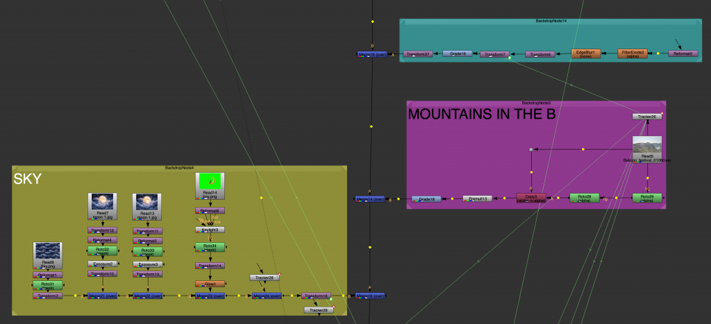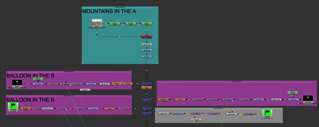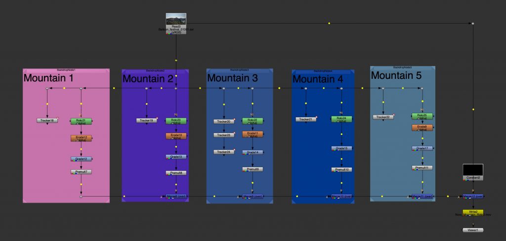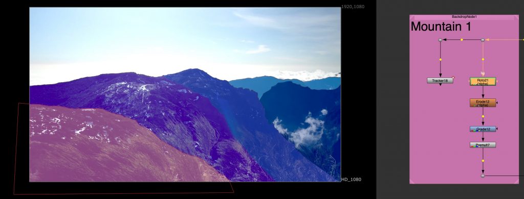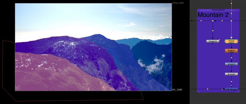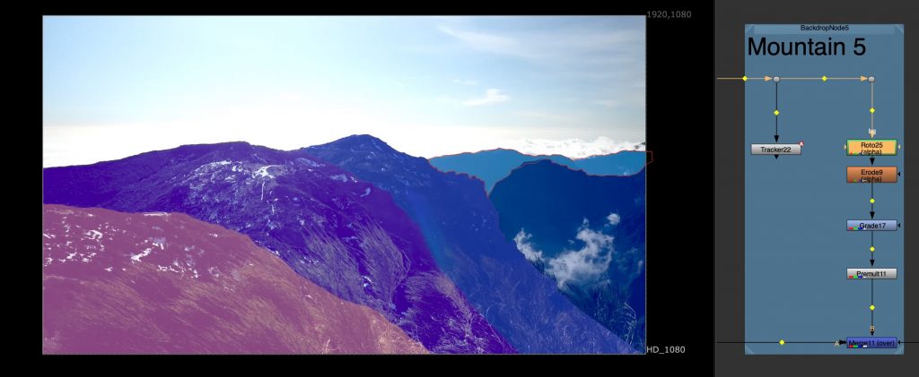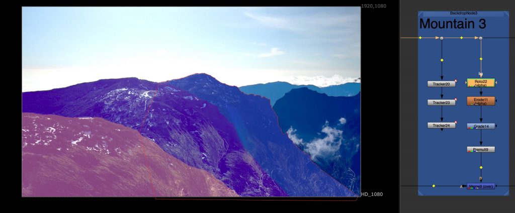 Another task involved tracking multiple mountain layers from aerial footage. Each mountain plane was treated separately, allowing us to understand depth and parallax within the scene. This exercise was done in preparation for a later balloon festival project and helped introduce a more structured node workflow, as well as a clearer understanding of how environments can be broken down into manageable layers.