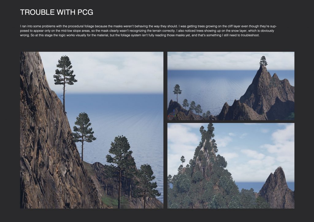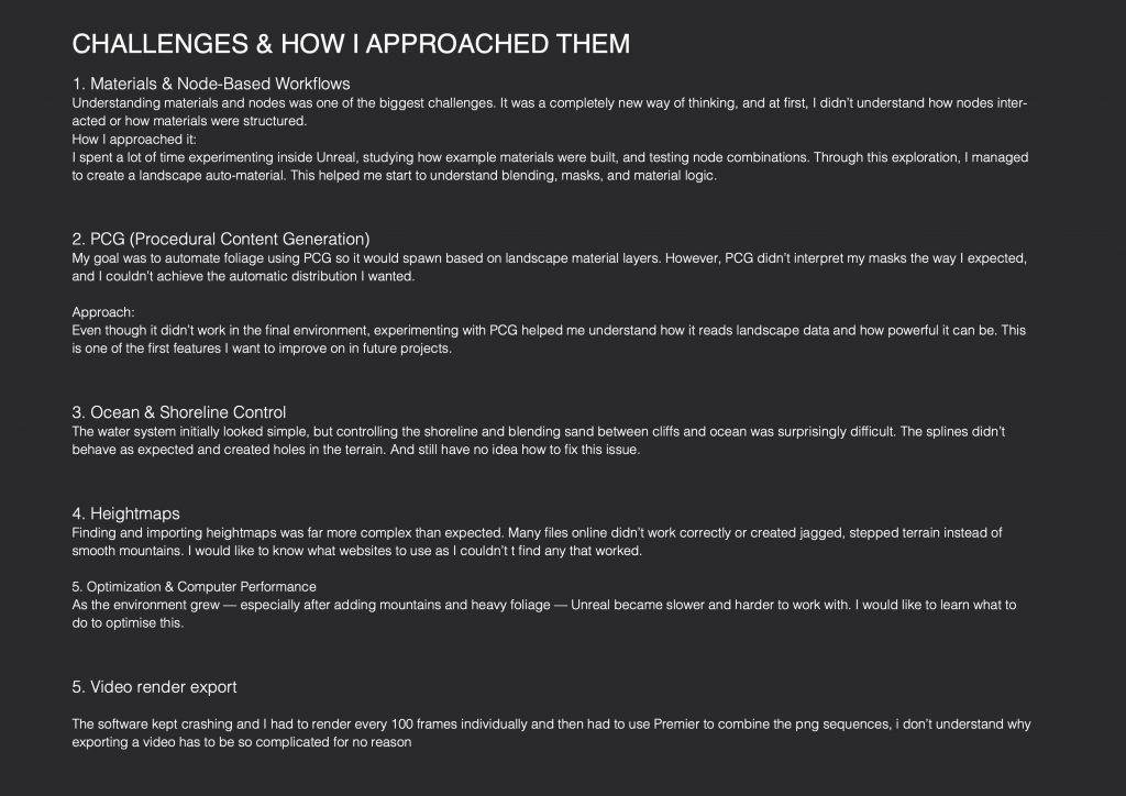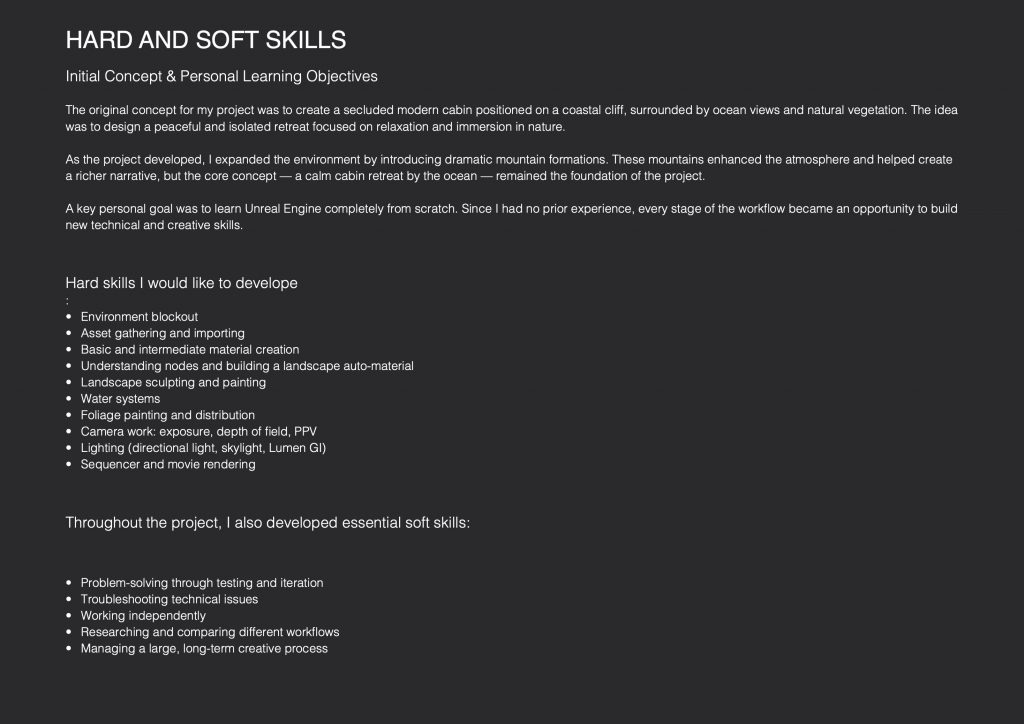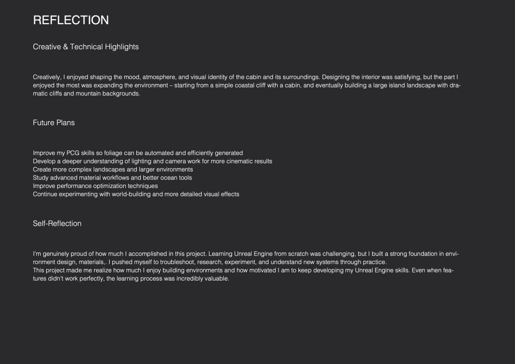 For the Unreal Engine classes, I did not produce detailed weekly documentation, as the sessions were mainly focused on listening, observing workflows, and understanding concepts during class, followed by applying them independently at home in the “Cabin in the woods” project. Despite this, I have a clear overview of the tools and techniques covered throughout the semester, all of which were later applied in practice.