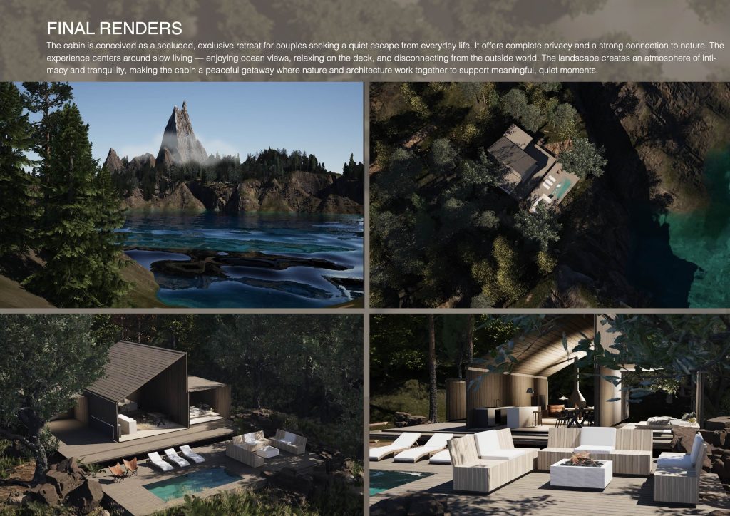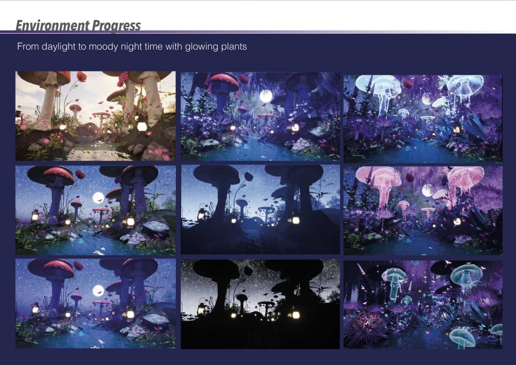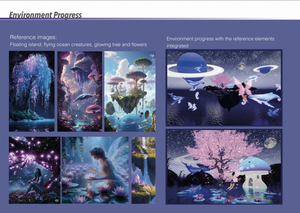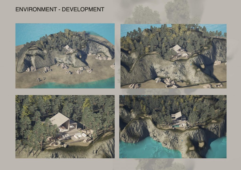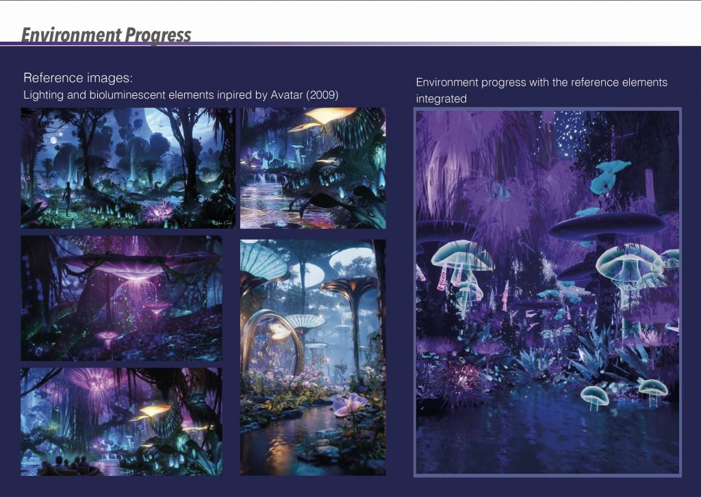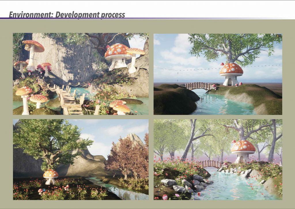 The focus of this project was the creation of a stylised CGI environment that invites immersion and a sense of wonder. Coming from a background in interior design, I had never worked on exterior environments before starting the MA, and this project became my first experience of building an entire world from the outside in. I found this process deeply rewarding and genuinely enjoyable, particularly the freedom of shaping atmosphere through light, colour, and scale. Developing the environment confirmed my interest in world-building as a central part of my creative practice.