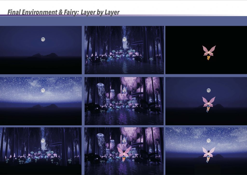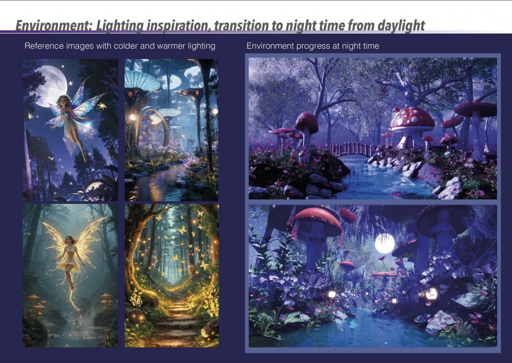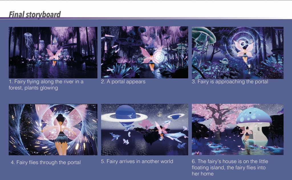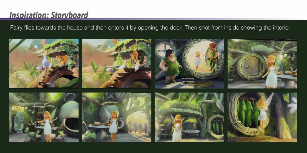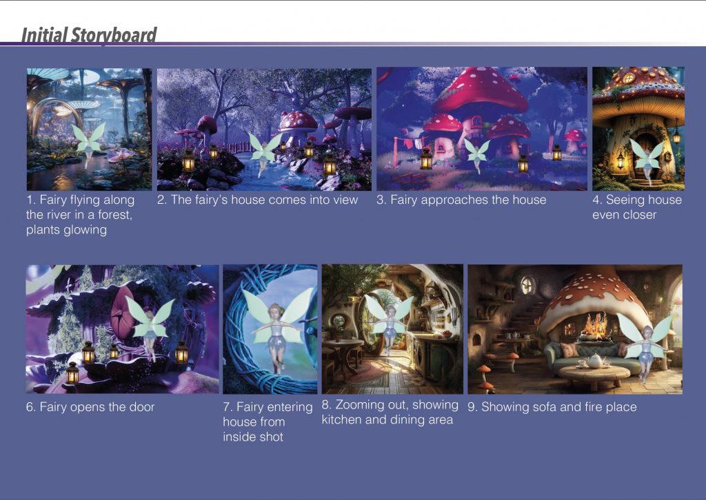 Based on this inspiration, I created my own initial storyboard to visualise how the environment and character would interact. The sequence begins with the fairy flying along a river within a forest, surrounded by glowing plants, before gradually revealing the mushroom house. The storyboard originally included interior shots of the house; however, it mainly served as a planning tool for composition, atmosphere, and the overall flow of the scene.