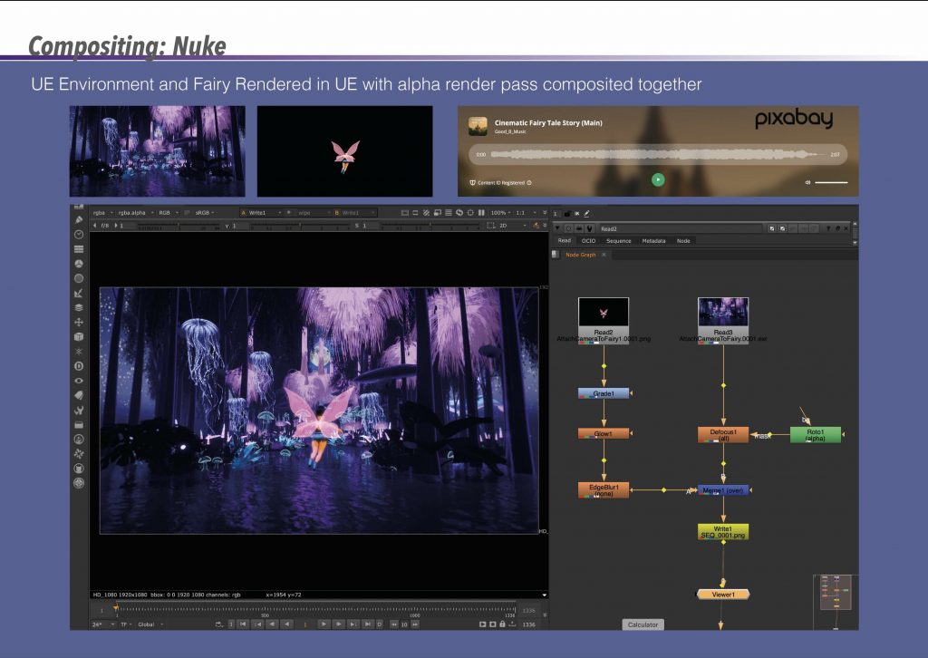 Once the renders were complete, the environment and fairy were composited together in Nuke using an alpha render pass. Basic colour grading, glow adjustments, and depth-based effects were applied to unify the elements visually. This process helped refine the final image and allowed me to enhance the fairy’s presence without overpowering the environment, which remained the primary focus of the project.