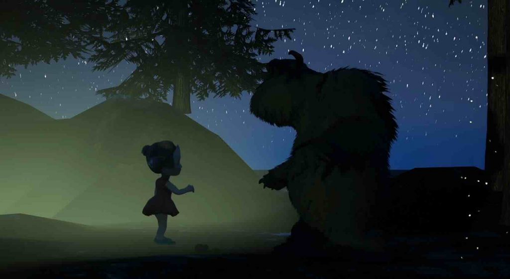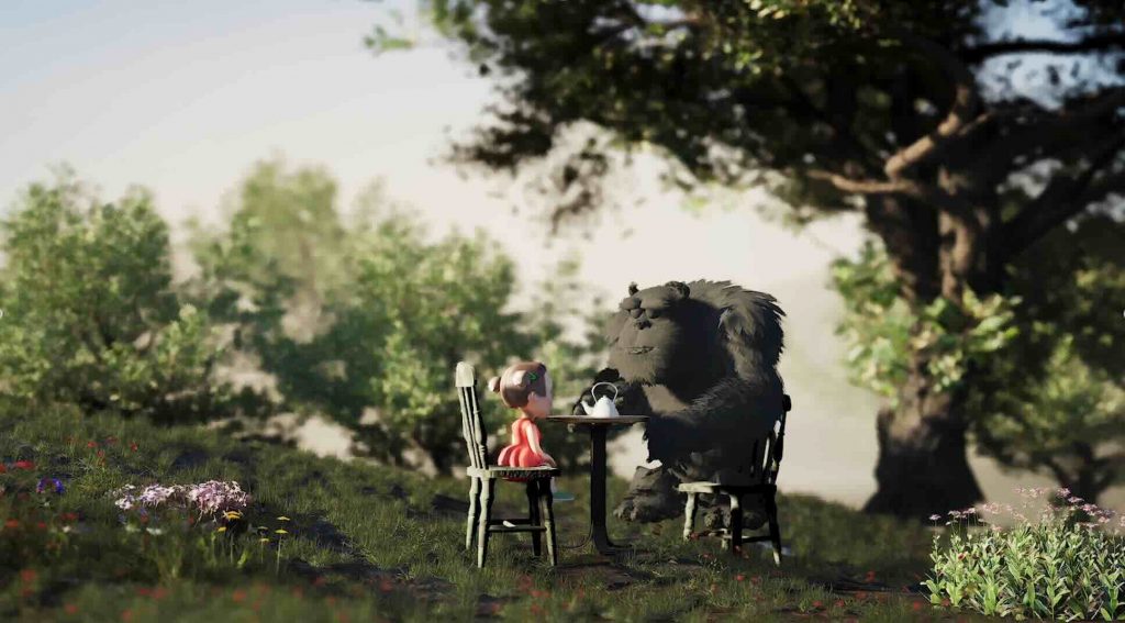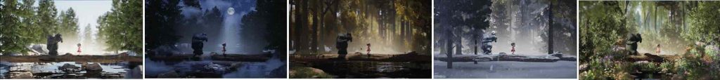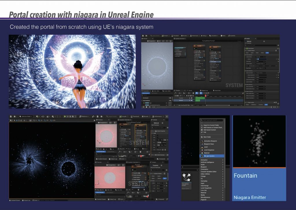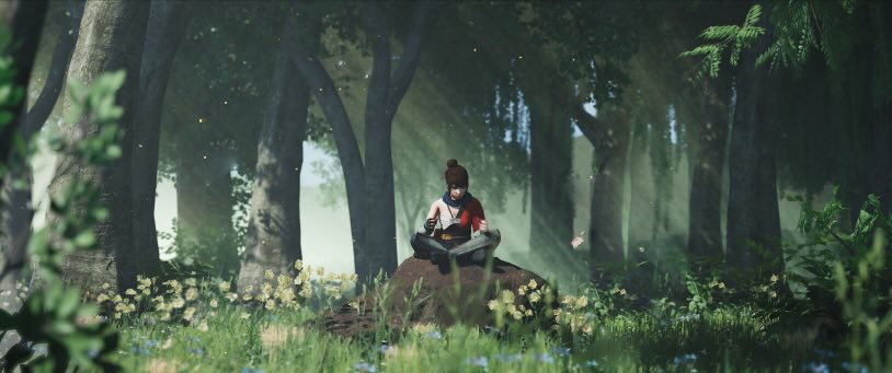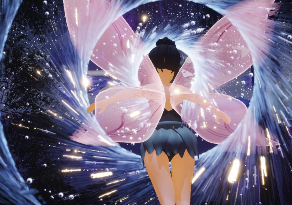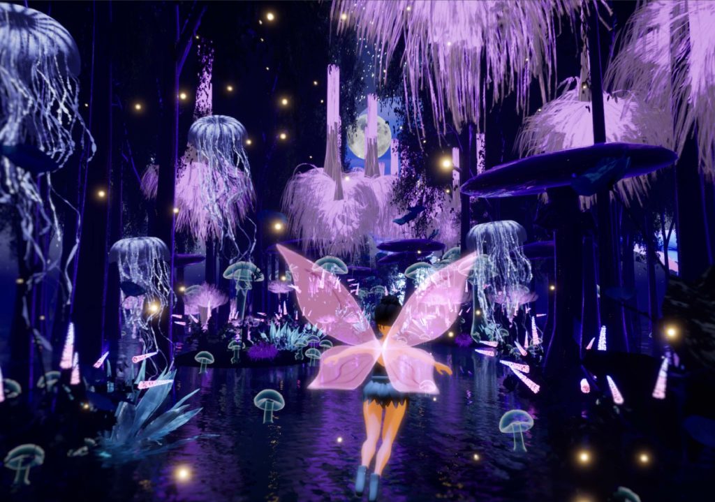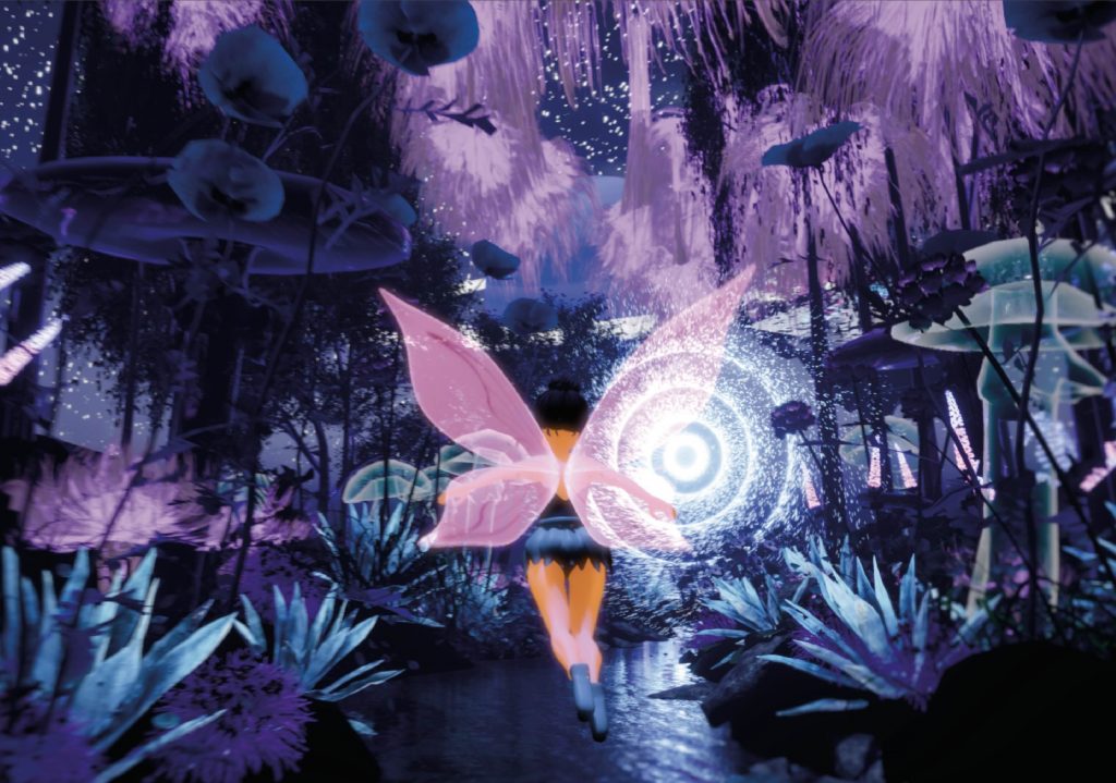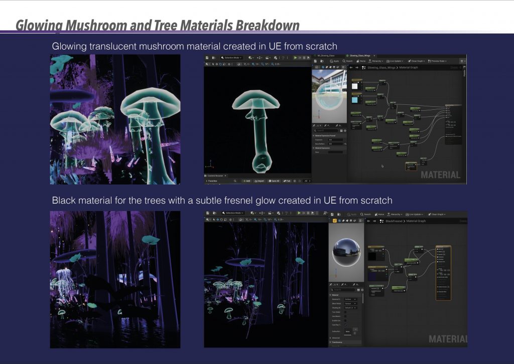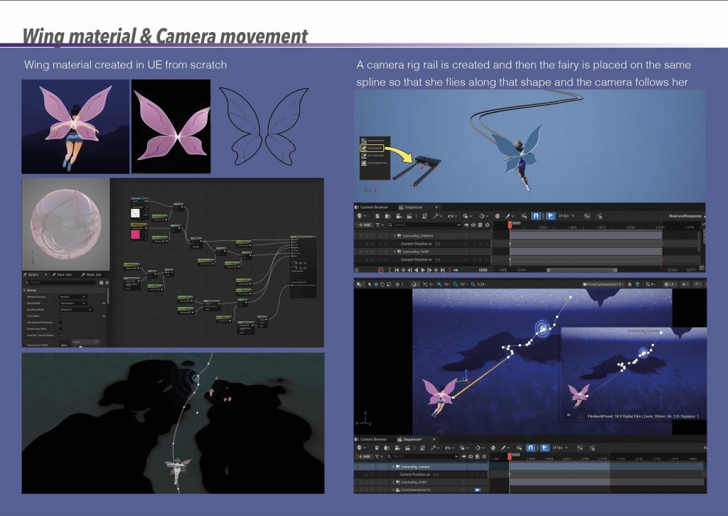 The fairy’s wing material was created from scratch in Unreal Engine using a translucent, glowing shader to complement the surrounding bioluminescent elements. To animate the sequence, a camera rig rail was used, allowing the fairy and camera to follow the same spline. This approach created smooth, controlled movement through the environment and reinforced the sense of flow and direction within the scene.