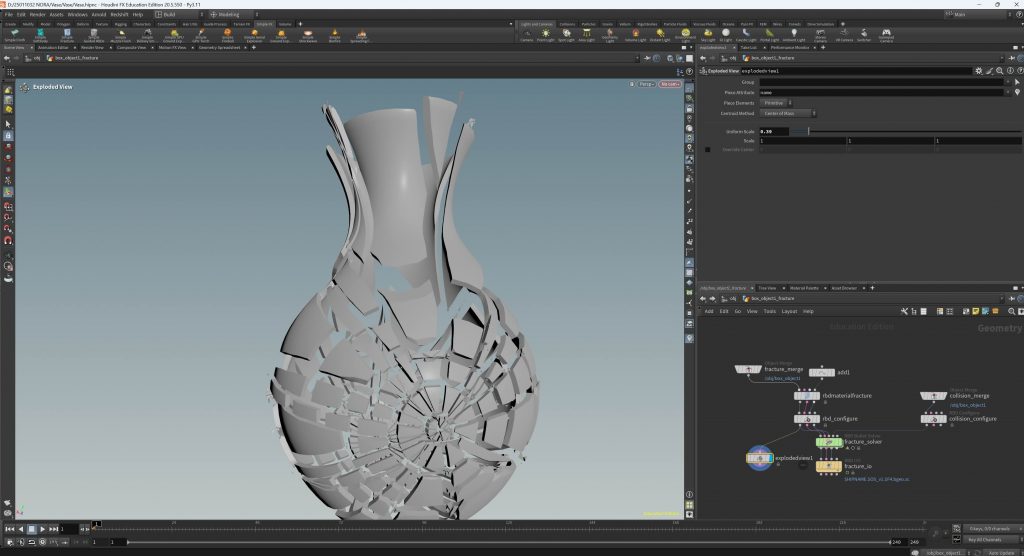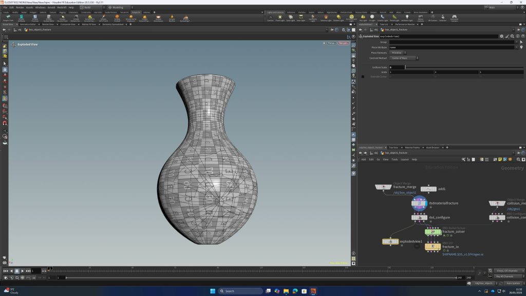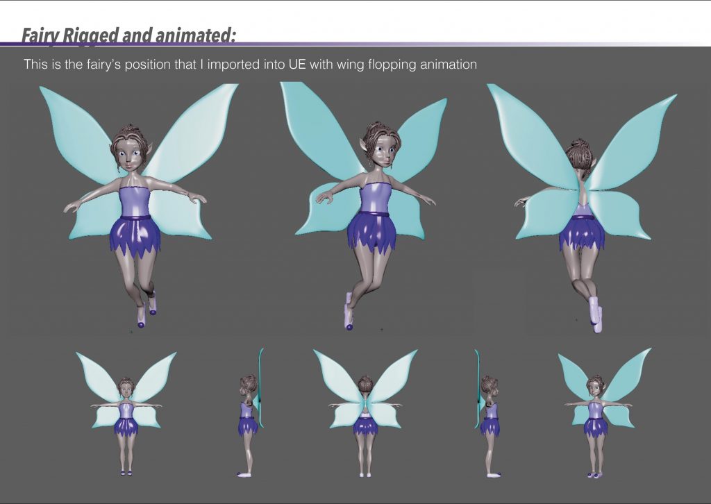 The fairy character was introduced as a subtle presence rather than a narrative lead. I had never modelled or rigged a character prior to this project, which made this stage challenging, but also an important learning experience. The story is intentionally not driven by action or character performance; instead, the fairy’s movement simply guides the viewer through the space, allowing the environment itself to remain the emotional core of the piece.